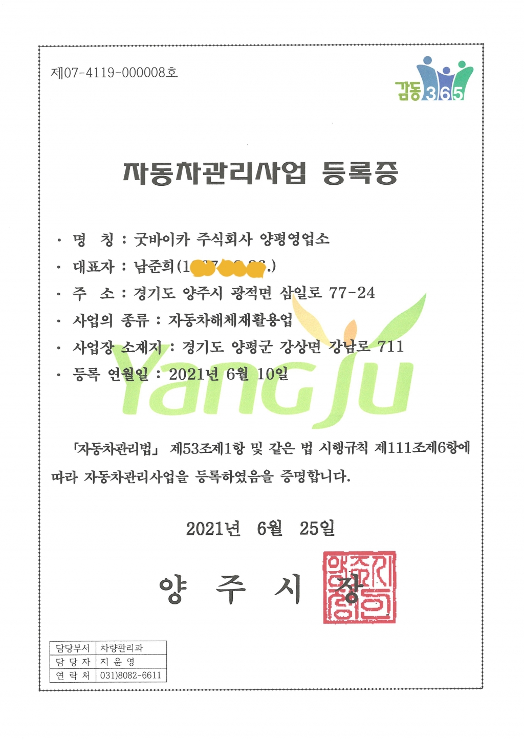 상호명 : 굿바이카(주)|대표자 : 남준희 | 사업자번호 : 390-88-00430  |  관허번호 : 제03-4119-000015호