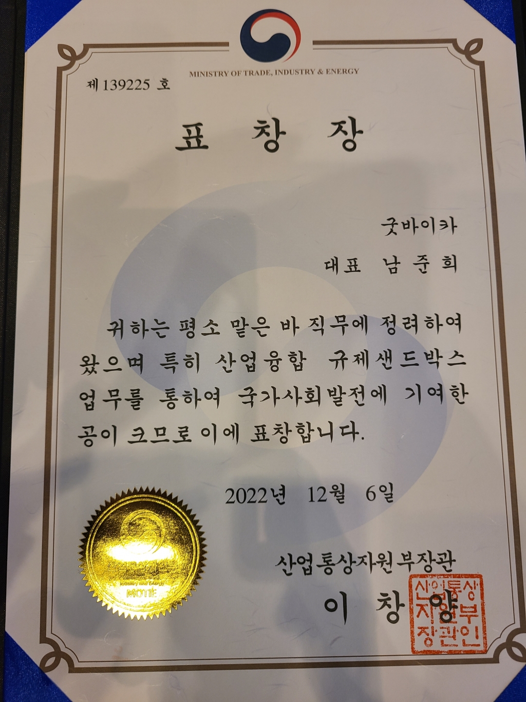 산업통상자원부 장관 표창장을 또 받았습니다. 2022-12-06 1511
