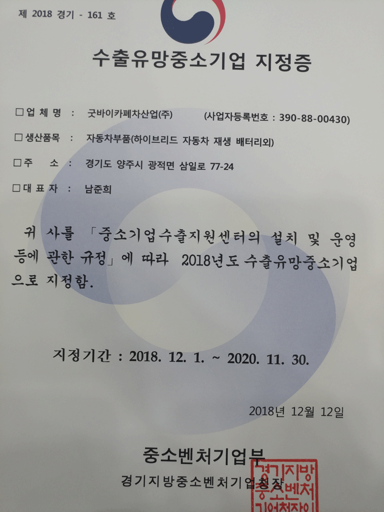 "2018 수출유망중소기업" 지정 - 굿바이카폐차산업(주) 2018-12-12 5308