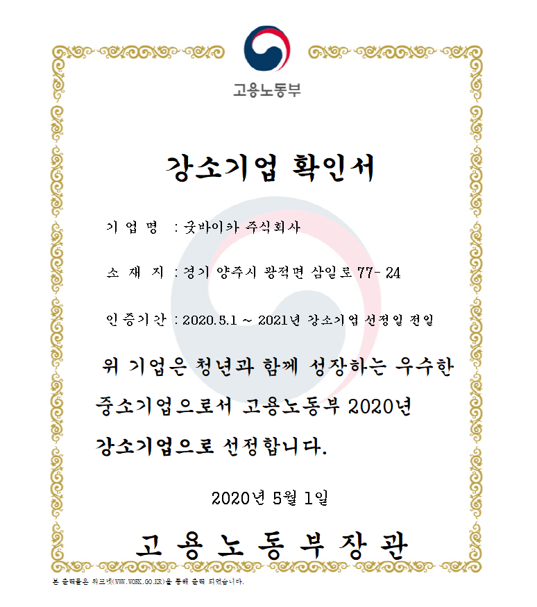 #굿바이카 2020년 고용노동부 강소기업에 선정되었습니다. 2020-05-05 4536